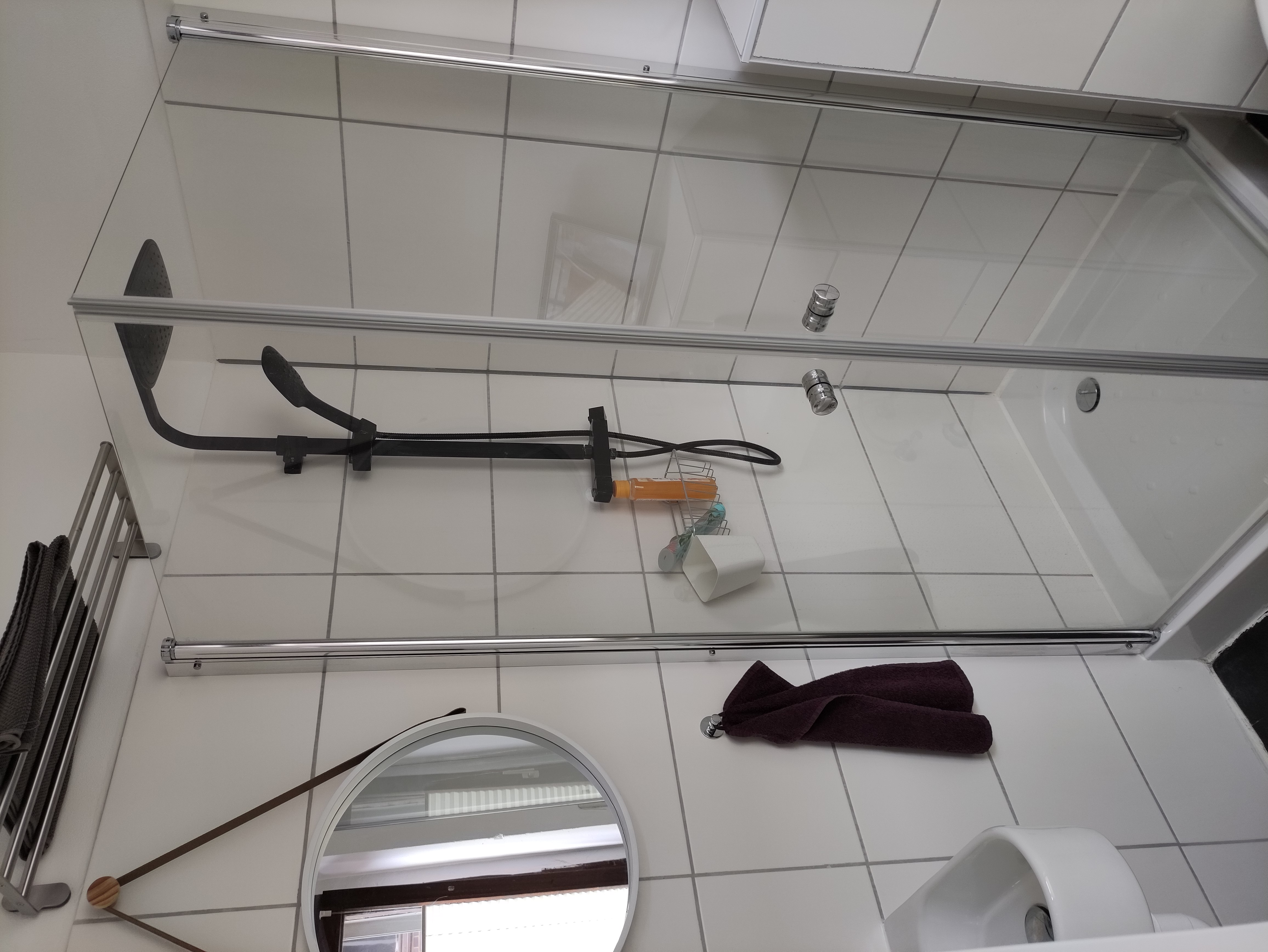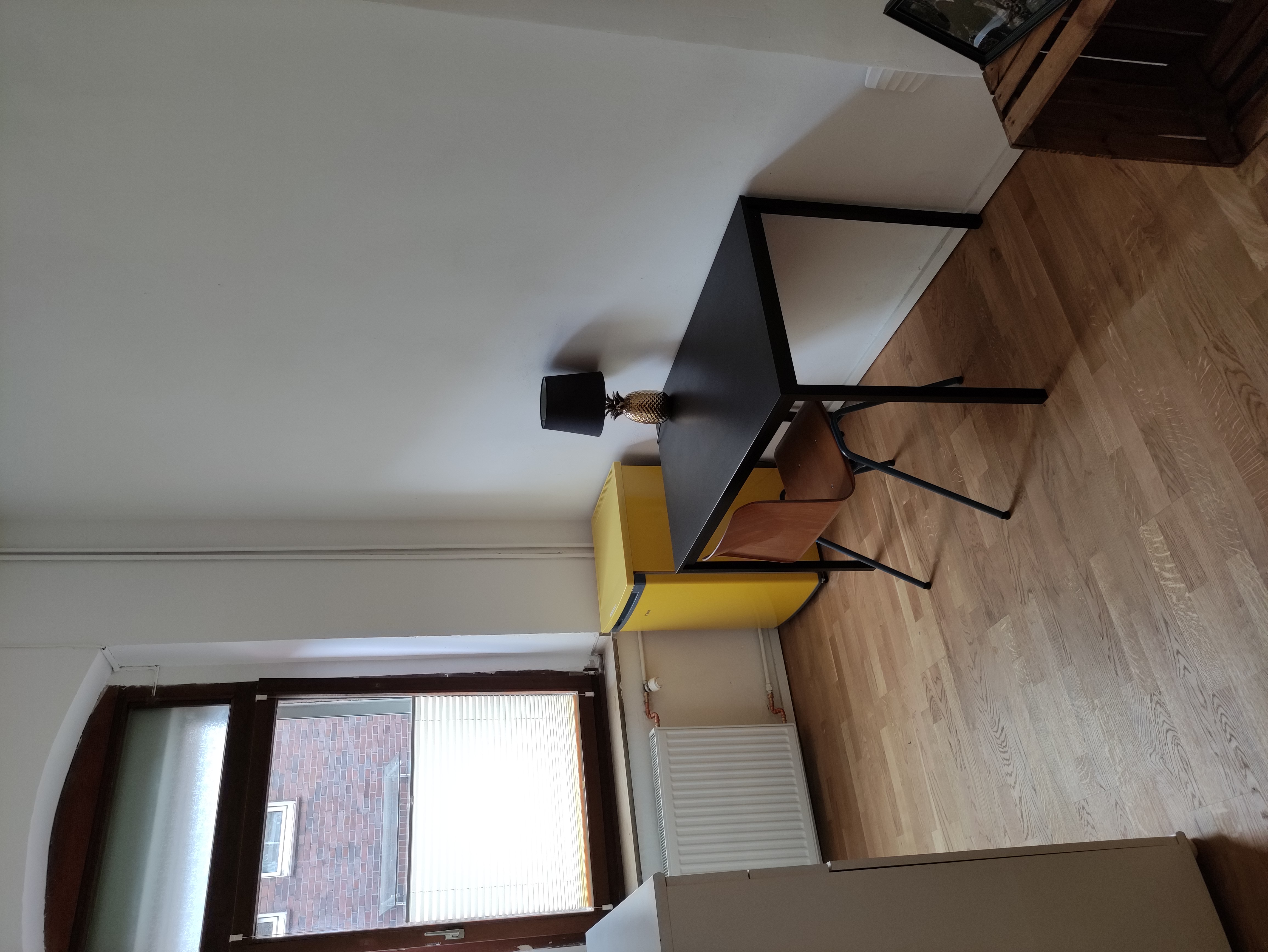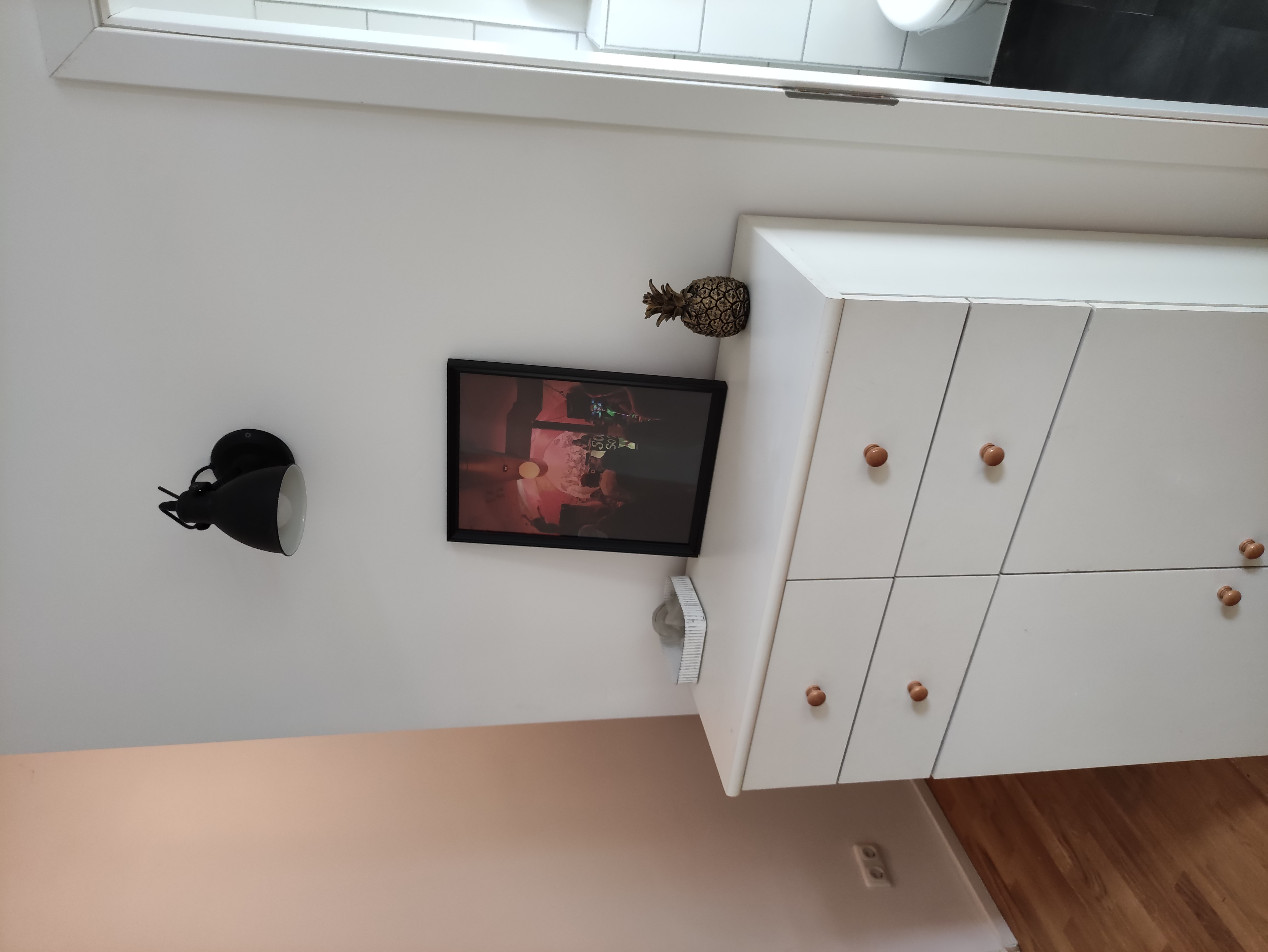 Im Wohn/Schlafzimmer findest du einen Tisch mit zwei Stühlen, einen Kleiderschrank sowie ein großes Bett (1,60 x 2,00). Der Raum ist hell und freundlich eingerichtet, so dass du dich wie zu Hause fühlen wirst. Wenn du nach einem langen Tag entspannen möchtest, kannst du den TV mit Smart Box einschalten und auf Netflix, Prime und Live TV (Joyn) zugreifen.