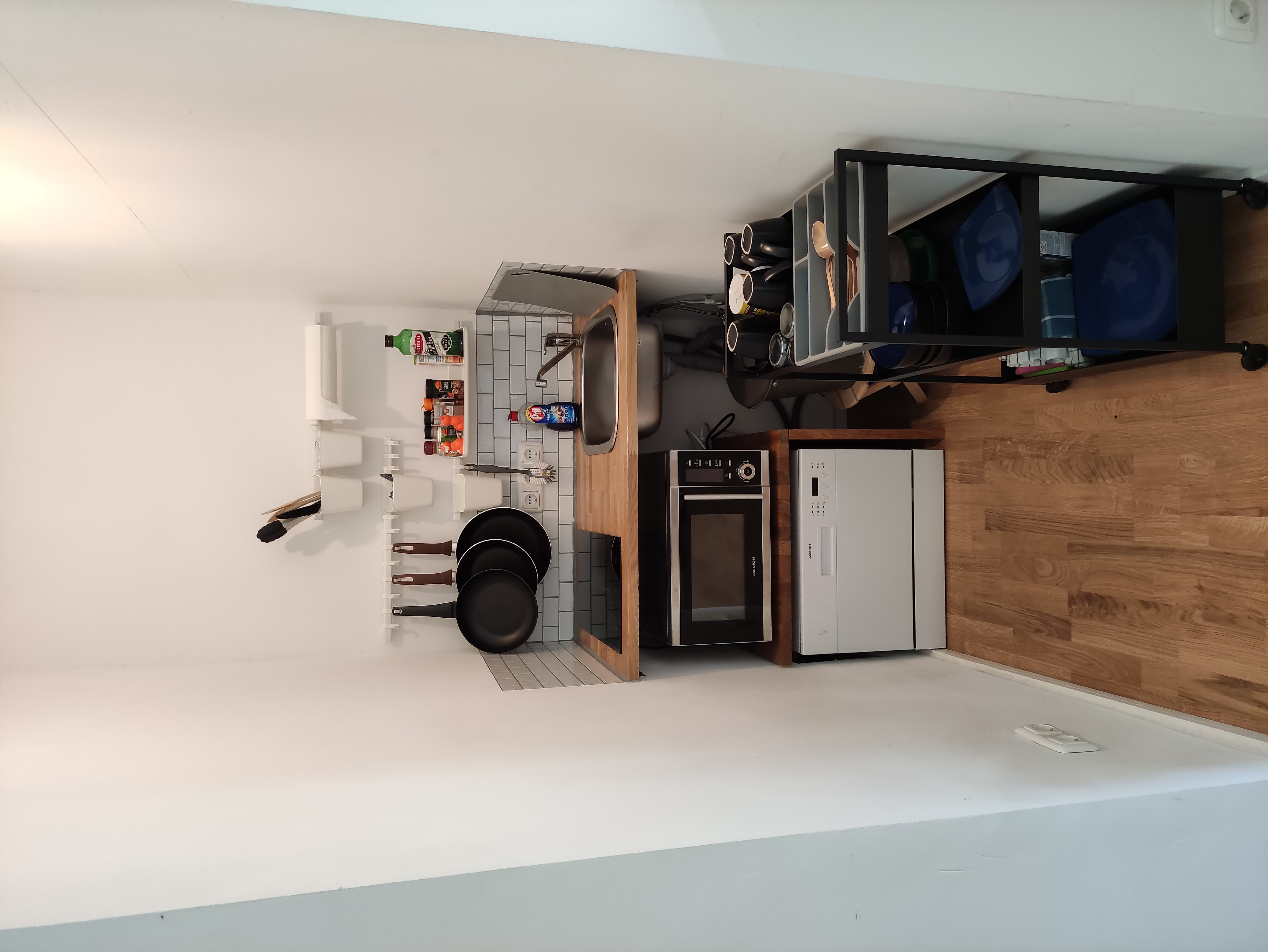 Die Küchenzeile ist voll ausgestattet und bietet alles, was du für die Zubereitung von Mahlzeiten benötigst. Es gibt einen Wasserkocher, eine Mikrowelle mit Ofengerät, Induktionskochplatten und einen Geschirrspüler. Mit diesen Utensilien kannst du schnell und einfach kochen und das Geschirr danach problemlos in der Maschine reinigen.